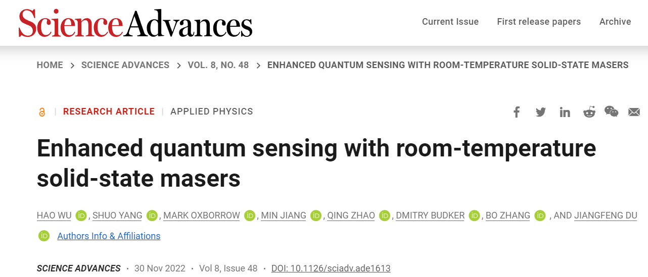 文章信息:H. Wu†, S. Yang†, M. Oxborrow, M. Jiang, Q. Zhao, D. Budker, B. Zhang*, J. Du, Enhanced quantum sensing with room-temperature solid-state masers. Sci. Adv. 8, eade1613 (2022).(†为共同一作,*为通讯作者)