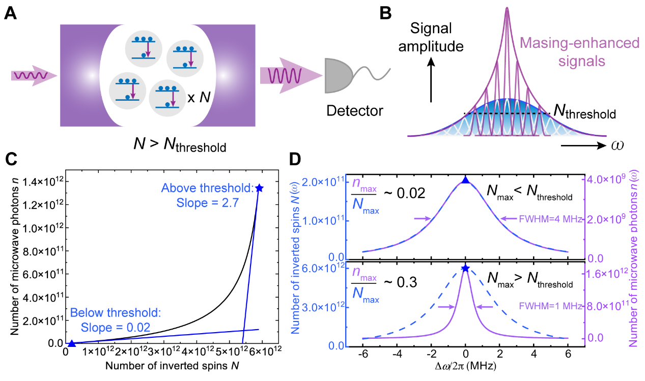 为了消除上述限制因素的影响,研究人员提出将室温固态微波激射技术同量子传感相结合,从而提高灵敏度,原理如图1A和B所示。研究人员首先通过理论计算,证实了对于具有非均匀展宽的系综体系,微波激射的阈值效应以及信号放大作用可以使固态自旋系综的电子顺磁共振谱线变窄、信号幅度提升(图1C和D),为提升基于谱线斜率探测手段的量子传感技术灵敏度提供了条件。