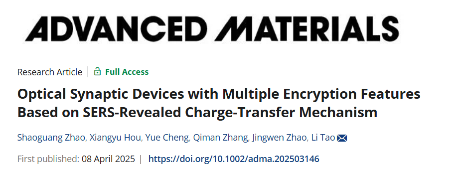 近日,pg游戏电子模拟器姚裕贵教授团队成员陶立教授课题组在Advanced Materials发表了一项重要研究成果,题为“Optical synaptic devices with multiple encryption features based on SERS-revealed charge-transfer mechanism”。具有原子级厚度的二维材料光学突触器件表现出构建高度集成的可调谐人工视觉神经网络的潜力。然而,原子级厚度也会导致光吸收较弱,限制了器件的光电性能。该研究提出的罗丹明6G染料(R6G)/InSe杂化结构器件展现了优异的光响应及光电突触性质,并从光谱学和光电子器件两种视角,证明了染料分子和二维InSe之间的电荷转移机制。通过表面处理有效调控了电荷转移的过程,并基于此实现了双重光学加密防伪应用。