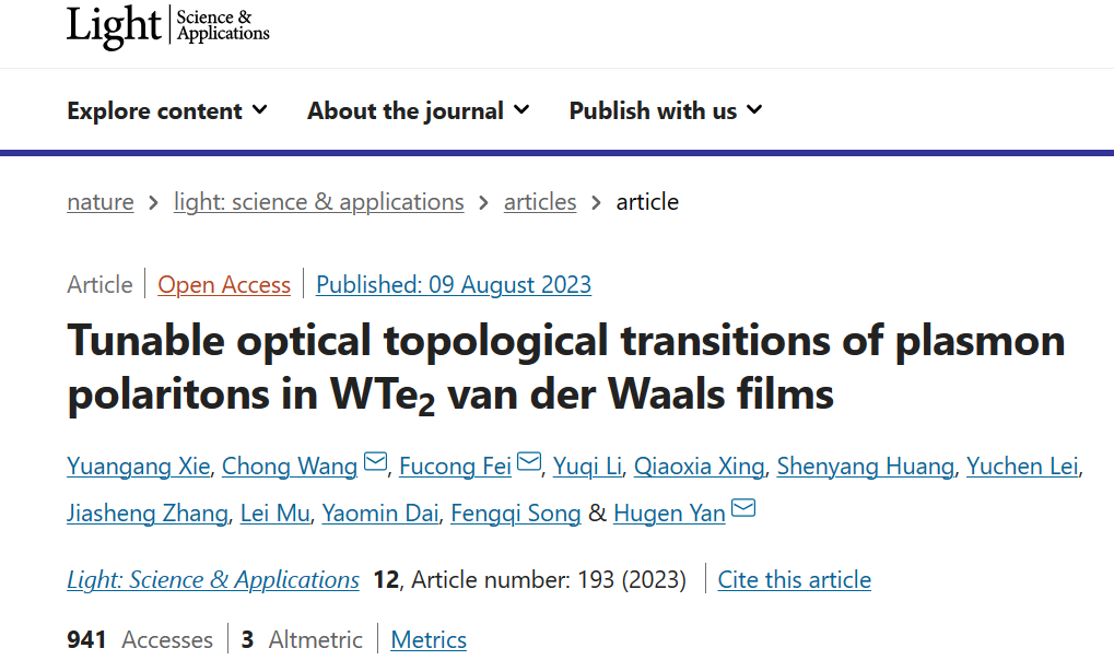 日前,pg游戏电子模拟器姚裕贵教授团队王冲特别研究员与复旦大学物理系的晏湖根教授团队、南京大学pg游戏电子模拟器宋凤麒教授团队合作,通过化学掺杂、温度手段对WTe2薄膜中等离激元的光学拓扑相变实现宽光谱范围调控,为可重构光子学器件的研究提供重要基础。相关研究题目为Tunable optical topological transitions of plasmon polaritons in WTe2 van der Waals films,成果被发表在光学顶级期刊《Light: Science & Applications》上(影响因子19.4)。