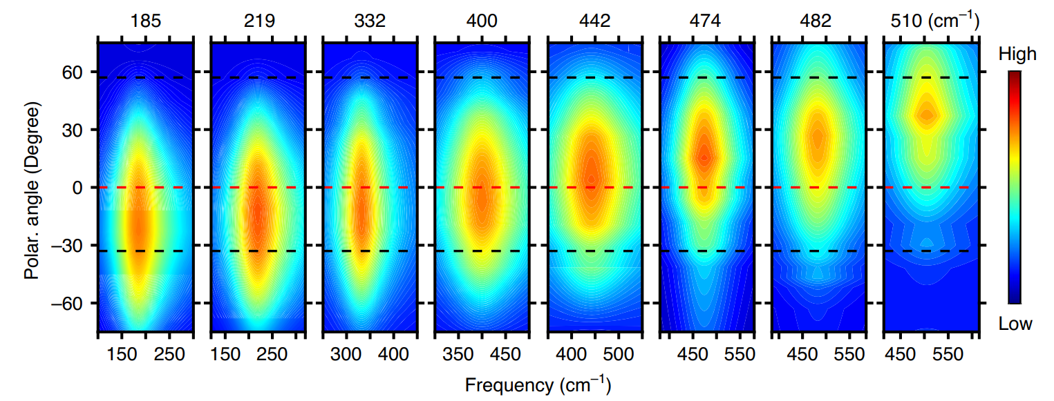 图1,WTe2等离激元强度最大值偏振角度随能量变化。在椭圆区间(<460cm-1)为负值,双曲区间(>460cm-1)为正值。