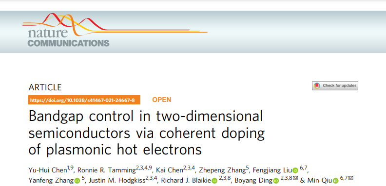 日前,pg游戏电子模拟器张向东教授课题组青年教师陈宇辉研究员与新西兰维多利亚惠灵顿大学、奥塔哥大学,以及北京大学和西湖大学的研究者开展合作,在表面等离子体光学腔和二维半导体二硫化钨的复合体系上,通过利用光和物质强耦合效应,在实验上实现了对二硫化钨的高效热电子掺杂,大幅改变了二硫化钨原有的带隙,相关研究成果发表在国际顶级期刊《自然·通讯》上。