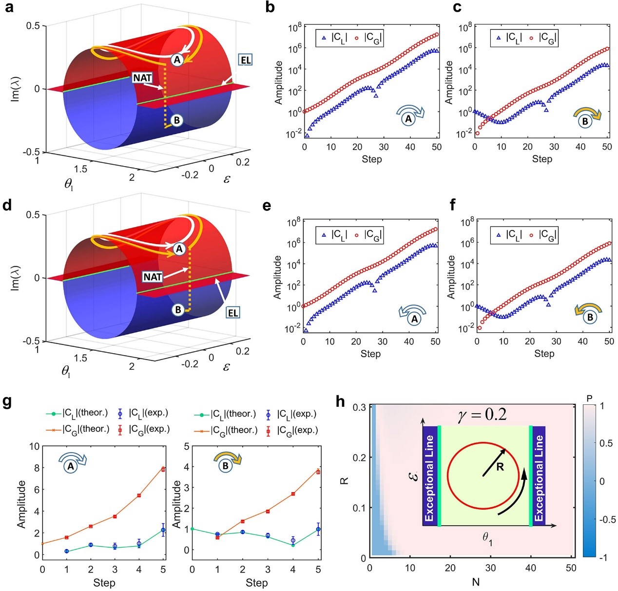 进一步,团队研究了有奇异线的非厄米量子行走中量子态环路演化。图 3a显示了顺时针环路演化过程中能量黎曼表面的演变轨迹。白色的轨迹显示了以量子态A为起点的绝热演化。在动态演化过程中保持在红色增益曲面上,最终状态返回到初始态。而当考虑以量子态B为起点时,该量子态起初在蓝色表面上演化,然后跳到红色曲面上(见黄色轨迹)。与有奇异点的非厄米量子行走不同之处在于,当环绕奇异点时,初始态B经历了非绝热跳变后又回到了自身,而这里的初始态B在经历了非绝热跳变后最终演化为另一个量子态A。而当演化方向改为逆时针(图3d),演化结果与顺时针的演化结果相同。因此环绕奇异线的动力学演化与环绕奇异点的手性行为不同。在环绕奇异线时,无论输入态或环绕方向如何,演化的最终态都是增益本征态。另外,对比有奇异点的量子行走,在环绕奇异线演化时,量子态转移的效率更高,如图3h所述。