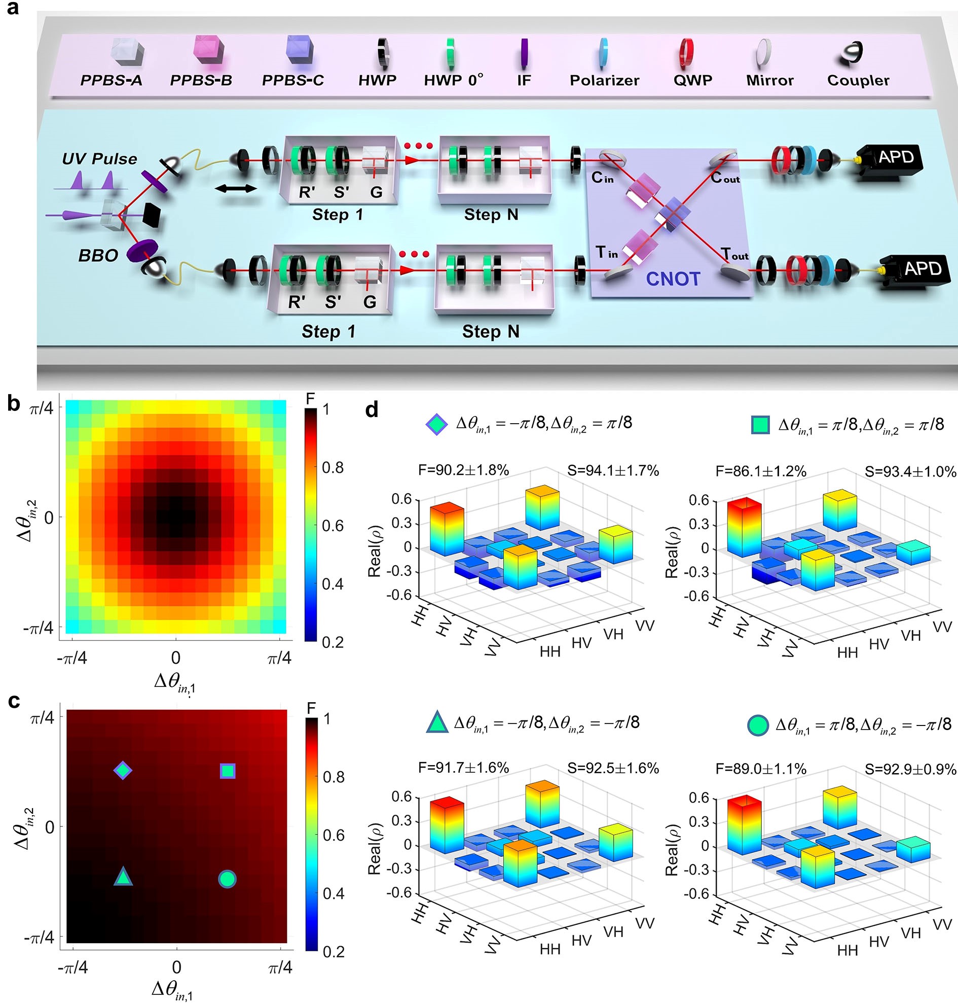 研究人员实验验证这一纠缠态产生方案的鲁棒性。实验上在入射前分别对上下两路光子加入扰动(− / 4, / 4)来模拟外界环境对入射态的影响。 如图4b所示,当光子直接传输至两比特门而未经过量子行走时,只有在几乎没有扰动的情况下,保真度才能保持较高的值。然而随着扰动的增加,保真度急剧下降,在图示的条件下保真度已经低于0.5。相反,如图4c所示,当上下两路光子都经过带有奇异线的非厄米量子行走时,几乎所有扰动下的保真度都很高。