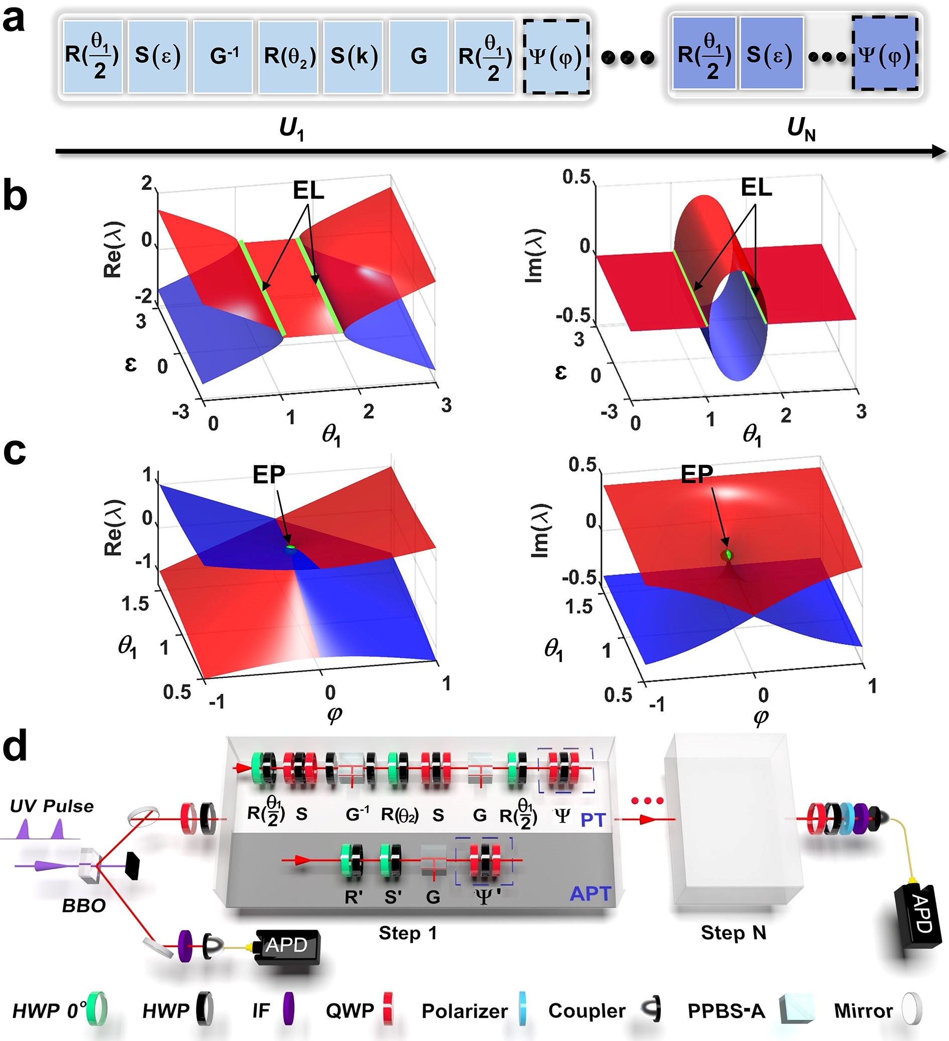 之前的研究都是使用哈密顿量来描述环绕奇异点的动力学特性。在该工作中,研究团队构造了非厄米量子行走来描述环绕奇异点或奇异线的动力学过程。如图1a所示是一个包含N步的非厄米量子行走系统来控制量子态的演化的示意图,其中第1步(N)的演化过程由时间演化算子U1 (UN )描述。这里的非厄米量子行走是由多种算符组成的。以第一步为例,可以表示为