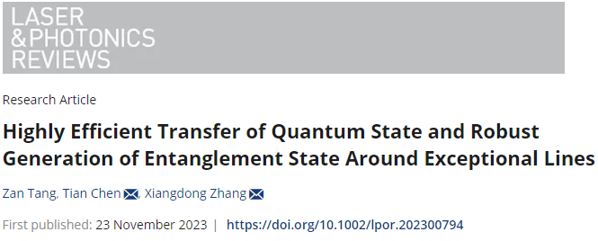 近日,pg游戏电子模拟器张向东教授课题组设计非厄米量子行走,实现了高效量子态拓扑调控。相关成果以“Highly Efficient Transfer of Quantum State and Robust Generation of Entanglement State Around Exceptional Lines”为题发表在Laser & Photonics Reviews 期刊[Laser Photonics Rev. 2023, 2300794]上。该研究工作得到了国家自然科学基金委的大力支持。pg游戏电子模拟器汤赞博士、陈天副教授为该论文的共同第一作者,pg游戏电子模拟器陈天副教授、张向东教授为论文共同通讯作者。