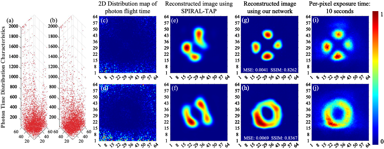 为了在极低光子通量下实现量子擦除过程的高保真二维可视化,研究团队突破首光子成像方法的“空间-时间”三维数据结构的局限,创新性地以光子计时模式(photon timing)取代传统的光子计数模式(photon counting),首次实现了适用于量子纠缠结构的四维“首光子物理增强双分支残差注意力网络”(first-photon physics-enhanced dual-branch residual attention network,FPDRANet)架构。