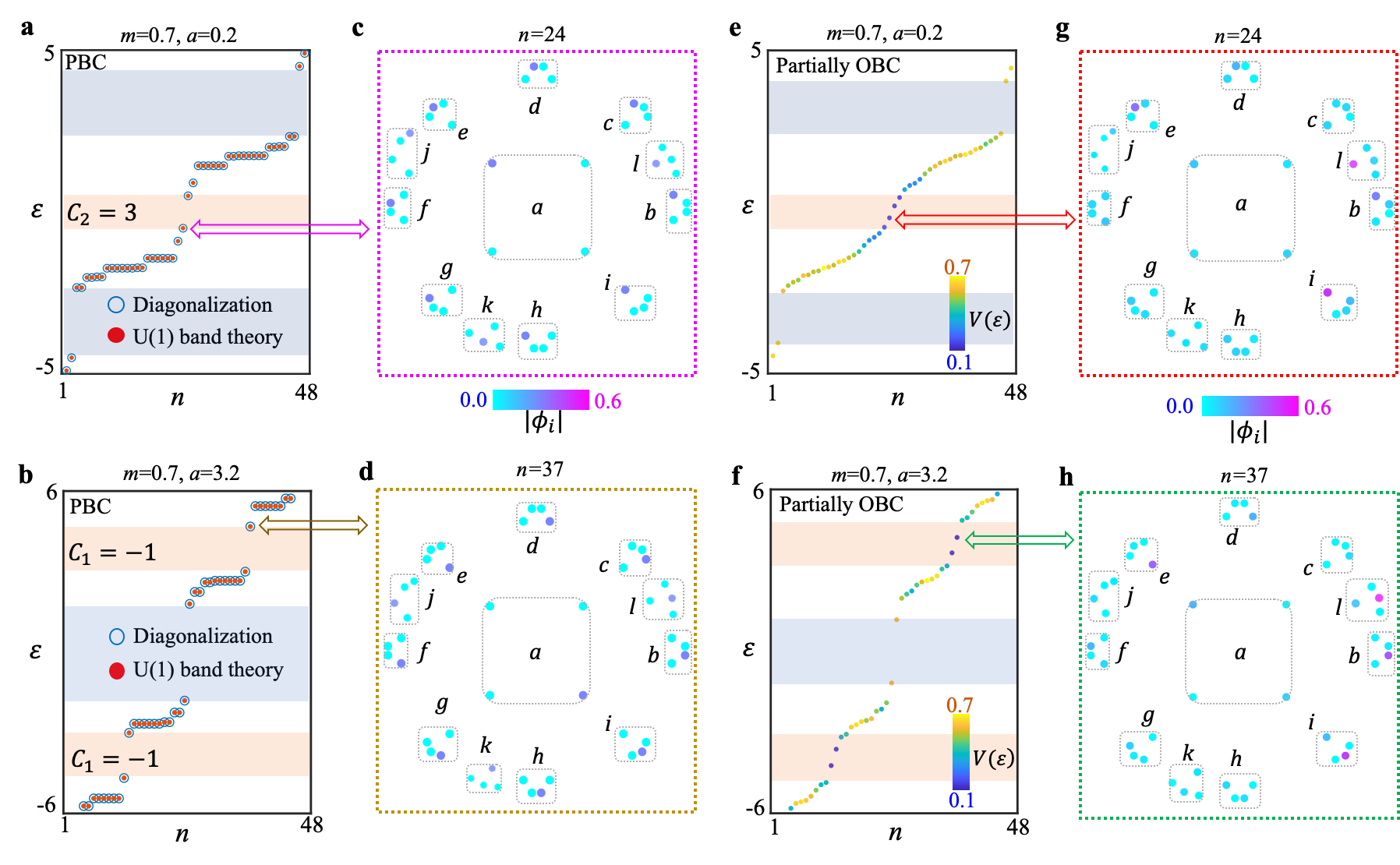 为了研究非平庸双曲晶格的边界态,研究人员构建了具有12个原包的有限双曲模型。12个原包的具体位置在图1a被字母标记(‘a’到‘l’)。图2a和2b显示的是利用直接对角化和双曲能带理论计算的有限周期双曲晶格的本征能谱。可以看到两者完全吻合,证明了双曲能带理论的有效性。具有非平庸二阶(图2a)和一阶(图2b)陈数的拓扑带隙用橘黄色的区域标记出来,而蓝色区域对应平庸带隙。图2c和2d分别显示了具有非平庸二阶和一阶陈数的有限双曲周期晶格的体模式分布图。为了观察双曲拓扑诱导的边界态,研究人员进一步构建了具有部分周期边界条件的双曲晶格模型,其本征能谱显示在图2e和2f中。可以清楚的看到,具有非零二阶(图2e)和一阶(图2f)陈数的带隙中出现了边界局域态,而平庸带隙中没有边界态产生。二阶和一阶陈数诱导的边界态空间分布显示在图2g和2e中。上述结果清晰的显示,具有非平庸二阶(和一阶)陈数的双曲带隙中存在双曲拓扑边界态。