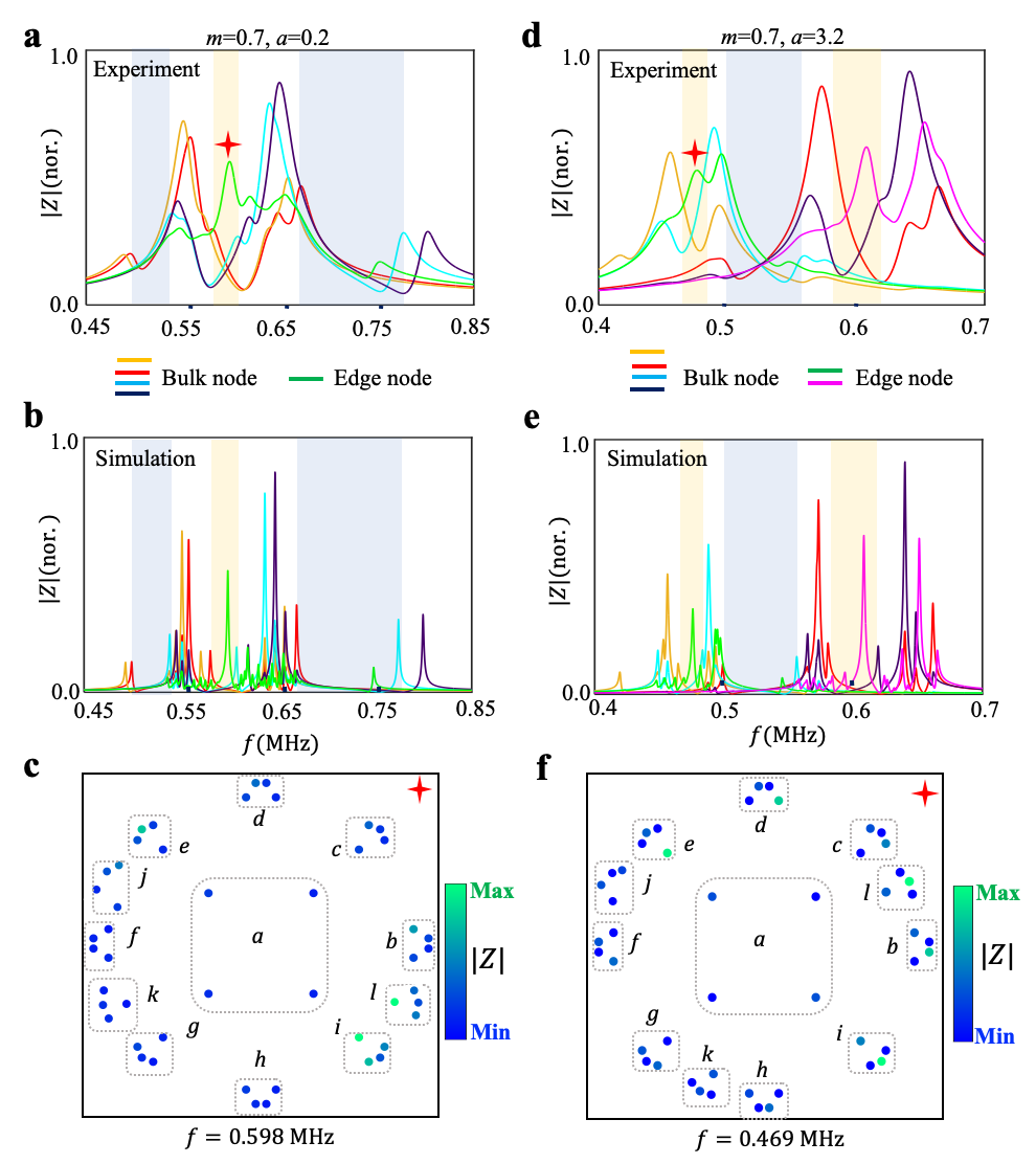 进一步,研究人员对具有部分开边界的双曲电路样品进行了实验测量。图4a和4d以及4b和4e分别对应实验测量和理论仿真的电路阻抗结果。可以看到双曲电路的边界格点在具有非零二阶(图4a和4b)以及一阶(图4d和4e)陈数的带隙区域具有显著的阻抗响应,而在平庸带隙没有阻抗峰值。图4c和4f进一步显示了边界态所对应频率下的电路阻抗分布图。可以清楚的看到,具有非零二阶和一阶陈数的双曲拓扑带隙中存在边界态,其空间分布与理论模型完全一致。