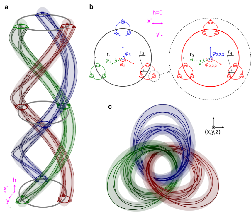 首先,研究人员理论设计了具有多拓扑不变量的嵌套式纽结结构。图1显示了构建嵌套式纽结的示意图。其中,图1a是该嵌套式纽结的辫子表示,它包含了由绿色、红色和蓝色标记的三类不同层级的零点线。为了更清楚地显示嵌套纽结的层级结构,图1b展示了起始端面的放大图。从中我们可以看到,半径为r1的第一代辫子由绿色、红色和蓝色标记的三条第二带辫子编织而成。同时,三条半径为r2的第二代辫子是由半径尺寸更小的第三代辫子编织而成。而半径为r3的第三代辫子是由半径为r4的第四代辫子编织而成。通过上述嵌套式的编织方式,最终具有分形几何结构的嵌套纽结可以被构建出来。如图1c所示,通过将图1a中辫子的起始端平面和终点端平面收尾相连,可以实现由四代辫子组成的嵌套纽结结构。由于这一新型的纽结结构具有分形式的嵌套结构,研究者称其为嵌套纽结(nested knots)。嵌套纽结这一概念的提出,是对纽结理论的拓展。