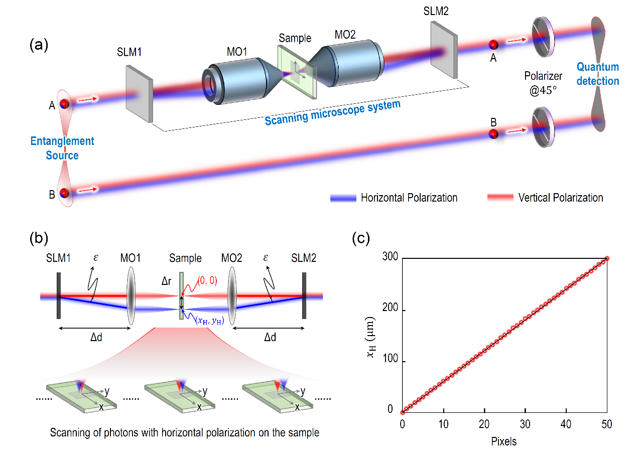 研究团队将量子全息技术引入显微镜系统,构建了一种新型的量子相位显微术——量子全息显微术(QHM)。QHM方案如图1a所示。QHM方案包含纠缠源、扫描显微系统和量子探测部分。扫描显微系统由两个空间光调制器(SLM1和SLM2)以及两个显微物镜(MO1和MO2)组成。扫描显微系统中光子的路径细节如图1b所示。SLM1用于加载一个衍射光栅,使光子的水平偏振态(|H⟩)的传播方向产生一个角度为ε的偏转。同时,SLM1还用于在光子的水平偏振态(|H⟩)和垂直偏振态(|V⟩)之间引入一个已知的相位差(φ)。MO1将|H⟩和|V⟩光子聚焦到样品上(如图1b的插图所示)。|V⟩光子的焦点是固定的,而通过调节SLM1上加载的光栅,|H⟩光子的焦点可以在样品上进行扫描。图1c展示了以6微米步长进行扫描的结果。图中的红球和黑线分别代表实验结果和理论结果。光子通过样品后,MO2和SLM2被用于对|H⟩和|V⟩光子进行准直和重叠。