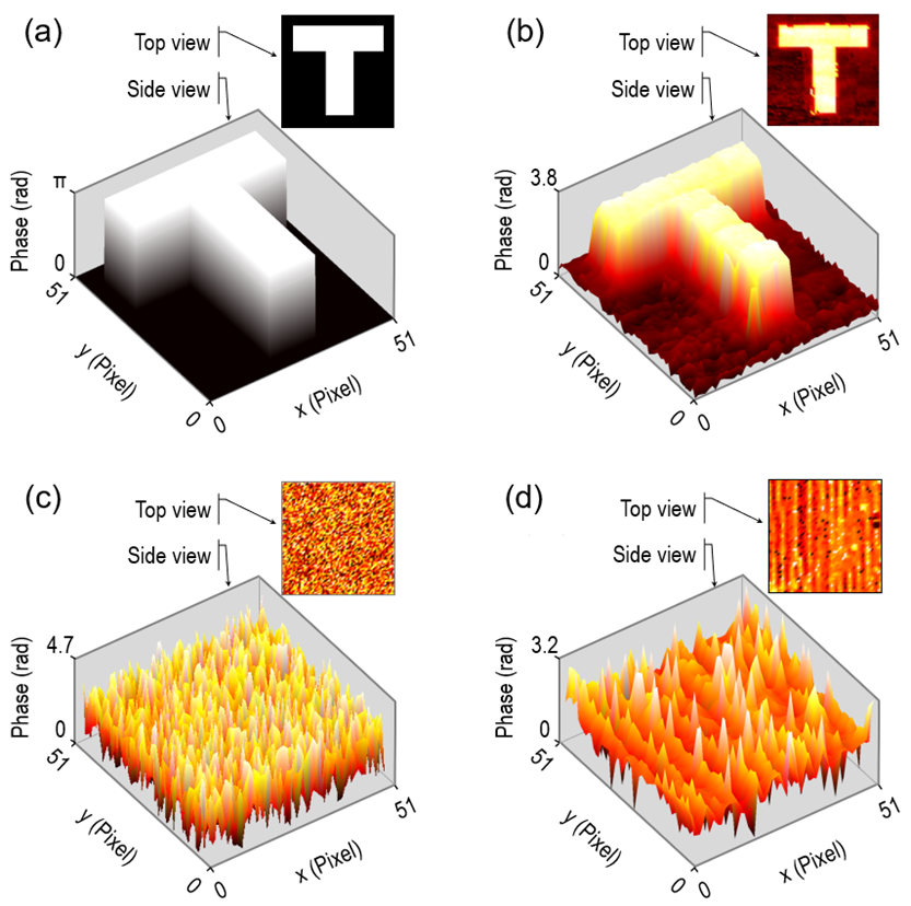 该团队构建的QHM对环境噪声具有鲁棒性。为了测试这一点,在量子全息显微实验中,将一盏日光灯发出的白光作为经典噪声进行照射。实验中使用的双折射相位样品是一个字母“T”,其相位分布如图3a所示。重建图像的实验结果如图3b所示。结果清晰地表明,即使在存在经典杂散光的情况下,相位图像也能够被准确重建。相比之下,当使用单光子而非纠缠态时,实验结果如图3c所示。此时图像变得过于模糊,无法显示出字母“T”。上述结果仅展示了其中一种噪声的情况。事实上,量子全息显微系统还能够对其他类型的噪声表现出鲁棒性,例如静态相位失序或去相干退相。