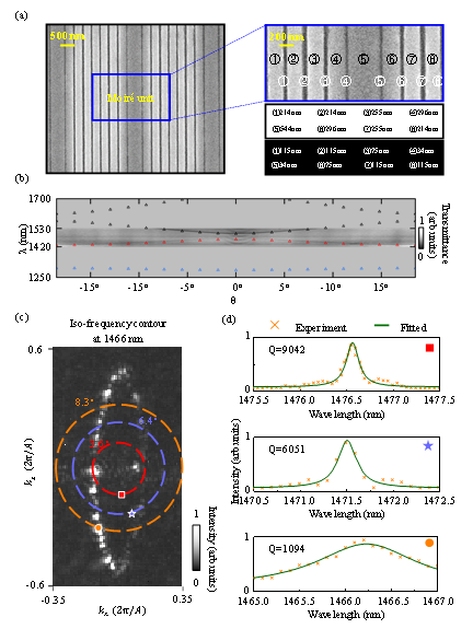 为了验证上述理论结果,研究人员制备了设计好的moiré 光子晶体样品。样品尺寸为500×500 μm2,包含约170个moiré周期。图3a展示了样品的扫描电子显微图像,右侧为单个单元的放大图。加工样品的尺寸与理论设计高度吻合。在图3b中,通过角分辨透射谱的测量,研究人员绘制了该结构的色散关系。可以看到一条色散较弱的能带出现在1440 nm附近,证实了moiré光子晶体的平带色散特性。同时,能带透射率在Γ点附近接近消失,表明该区域模式与外界的耦合极具减弱,从而验证了moiré BIC的存在。