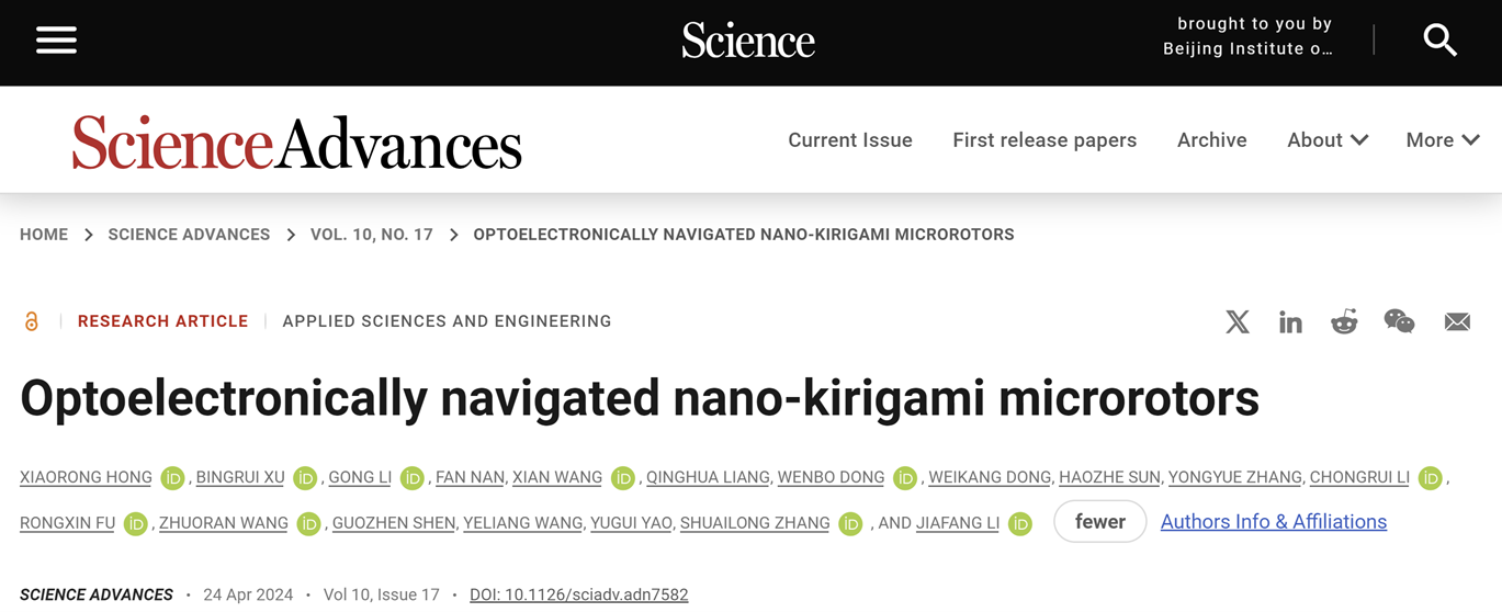 Xiaorong Hong#, Bingrui Xu#, Gong Li, Fan Nan, Xian Wang, Qinghua Liang, Wenbo Dong, Weikang Dong, Haozhe Sun, Yongyue Zhang, Chongrui Li, Rongxin Fu, Zhuoran Wang, Guozhen Shen, Yeliang Wang, Yugui Yao, Shuailong Zhang*, and Jiafang Li*. Optoelectronically navigated nano-kirigami microrotors. Science Advances, 10(17), adn7582 (2024).