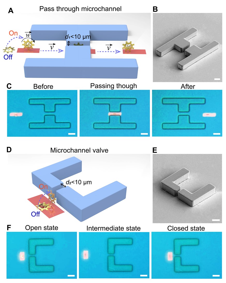 图4:纳米剪纸微型转子的微通道环境驱动。(A-C)纳米剪纸微型转子在站立状态下顺利通过狭窄微通道(宽度小于10 μm)实验的示意图、微通道SEM图像及驱动实验图像。比例尺:20 μm;(D-F)纳米剪纸微型转子在微通道前实现阀门的开放和关闭切换实验的示意图、微通道SEM图像及驱动实验图像。比例尺:20 μm。