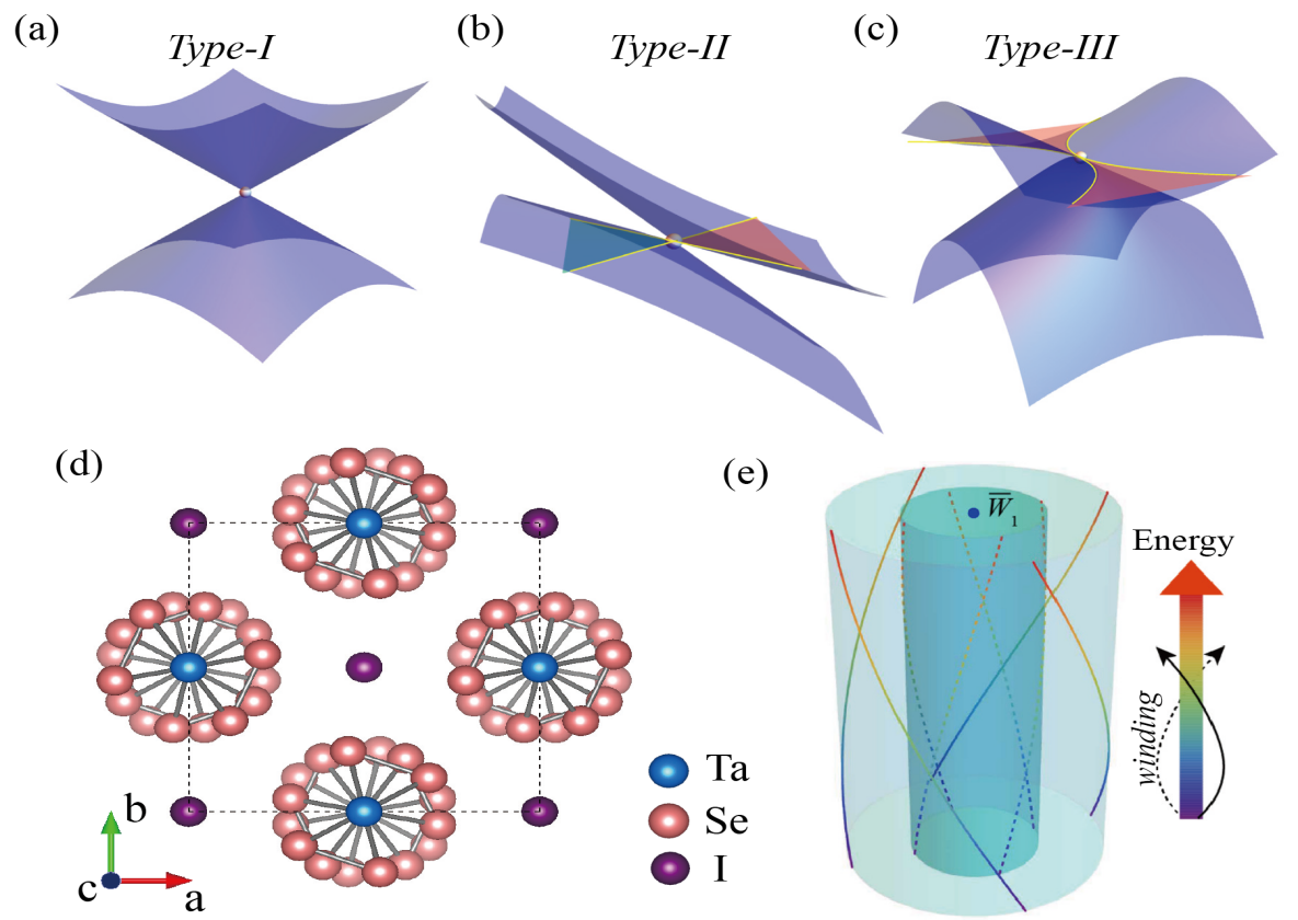 图 1 三类外尔点的示意图: (a) 第一类外尔半金属的点类型费米面。(b)第二类外尔半金属的电子-空穴口袋型费米面。(c)第三类外尔半金属的电子(空穴)-电子(空穴)口袋类型费米面;(d) Ta2Se8I的晶体结构 (e) 001面上四重螺旋表面态。