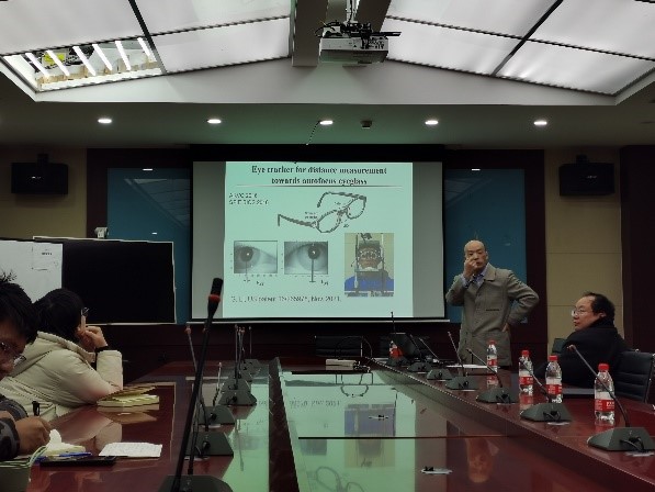 李国强教授在报告中提到:主动光学元件在视觉矫正与评估、光学成像以及智能感知领域有重要应用。首先,他介绍了基于液晶材料的变焦透镜、液体透镜、Alvarez 透镜在视光学中的应用,然后分别介绍自由曲面位相元件、MEMS 数字微镜阵列与变焦组合物镜在显微成像中的应用、基于可变偏振补偿器的激光扫描共焦偏振成像与临床应用等技术。报告过程中,李国强教授的讲解生动形象,其中,为老花眼、弱视等人群设计的智能眼镜,可自动调焦眼镜及青光眼探测仪等智能光学感知器件充分体现了科技对人类健康的重要贡献,为pg游戏电子官网师生留下了深刻的印象。