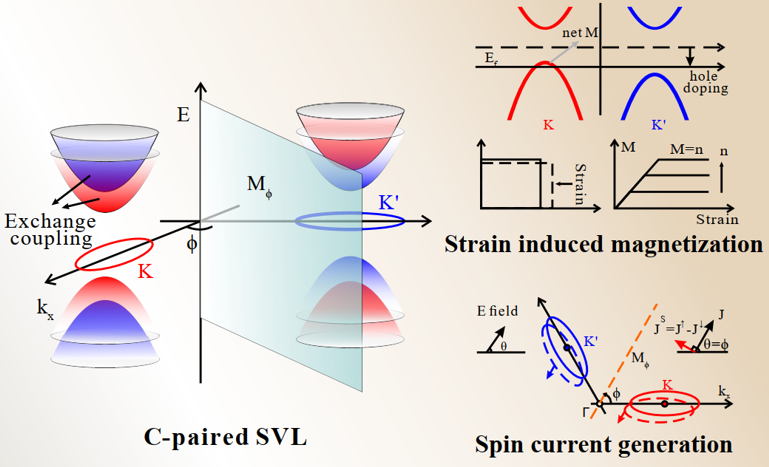 摘要: In this talk, I will take our recently proposed new type of spin-valley locking (SVL), named C-paired SVL, in antiferromagnetic systems. It directly connects the spin/valley space with the real space, and hence enables both static and dynamical controls of spin and valley to realize a multifunctional antiferromagnetic material. The new emergent quantum degree of freedom in the C-paired SVL is comprised of spin-polarized valleys related by a crystal symmetry instead of the time-reversal symmetry. Thus, both spin and valley can be accessed by simply breaking the corresponding crystal symmetry. Typically, one can use a strain field to induce a large net valley polarization/magnetization and use a charge current to generate a large noncollinear spin current. We predict the realization of the C-paired SVL in monolayer V2Se2O, which indeed exhibits giant piezomagnetism and can generate a large transverse spin current. Based on symmetry analysis and first-principles calculations, we also found C-paired SVL can exist in the following experimentally verified AFM materials, NaOsO3, LaMnO3, LaCrO3, TbFeO3, MnTe, RuO2, MnF2, FeF2, CoF2, and NiF2. All these predicted phenomena have been confirmed in recent experiments in RuO2 and MnTe. Our findings provide new opportunities to integrate various controls of spin and valley with nonvolatile information storage in a single material, which is highly desirable for versatile fundamental research and device applications. Reference: Nature Communications 12, 2846 (2021)