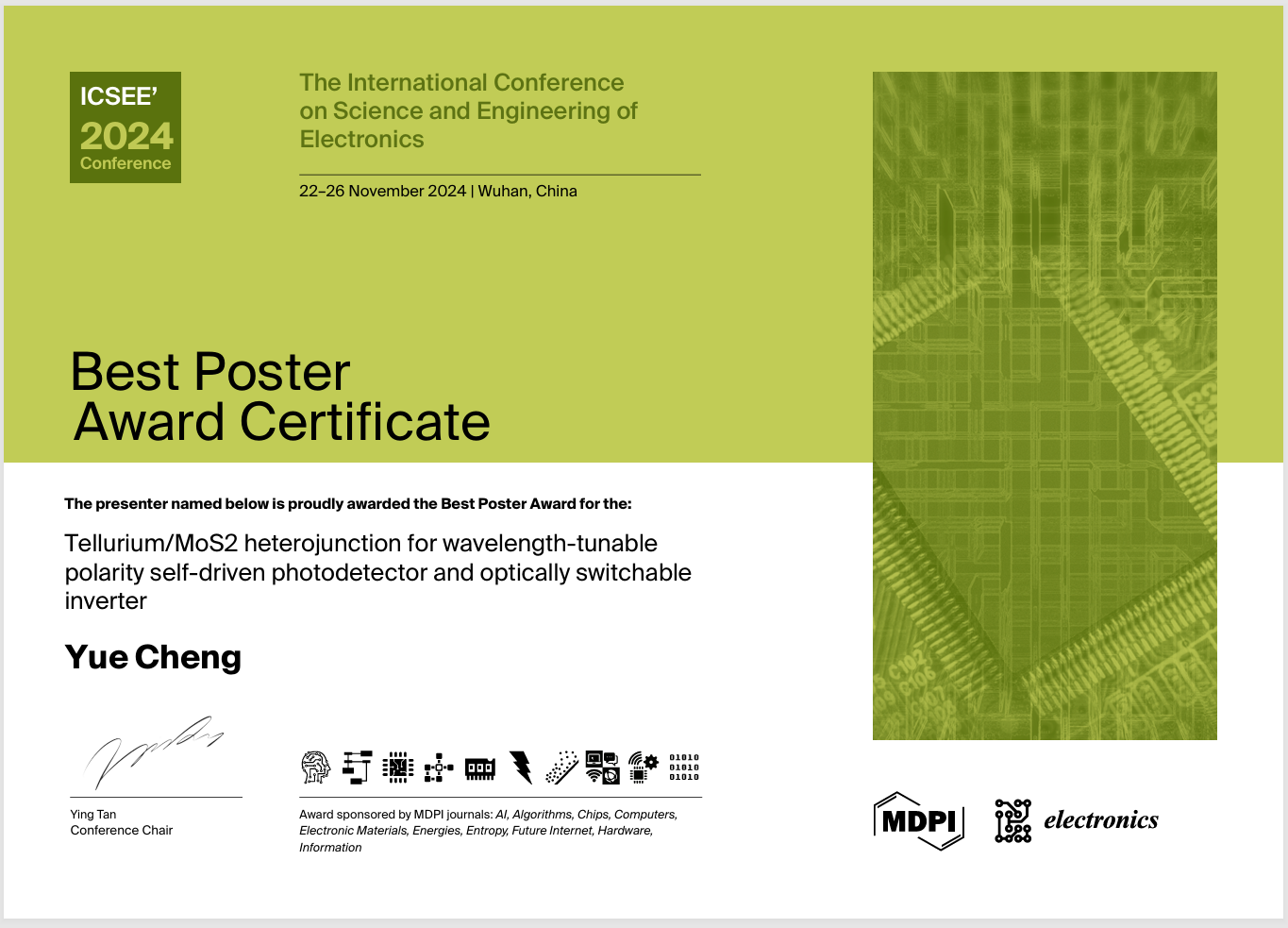 pg游戏电子模拟器陶立教授课题组博士研究生程悦参加本次大会并进行了学术海报展示,题目为:“Tellurium/MoS2 heterojunction for wavelength-tunable polarity self-driven photodetector and optically switchable inverter”。该海报受到组织委员会、与会同行学者和国内外专家的一致好评,荣获该会议唯一Best Poster Award(最佳海报论文奖)。该工作利用能带工程,选择新兴的高空穴迁移率二维红外半导体碲单质材料,与二硫化钼构建异质结,在单个光电子器件上实现了波长调控的光响应极性以及光照可切换的反相器功能,促进了集成元件的紧凑性,展示了二维半导体异质结构在光通信及逻辑电路等领域的应用。本次获奖体现了pg游戏电子模拟器近年来持续推进“双一流”学科建设和高质量研究生培养,大力支持研究生积极参与国际学术交流等系列举措。