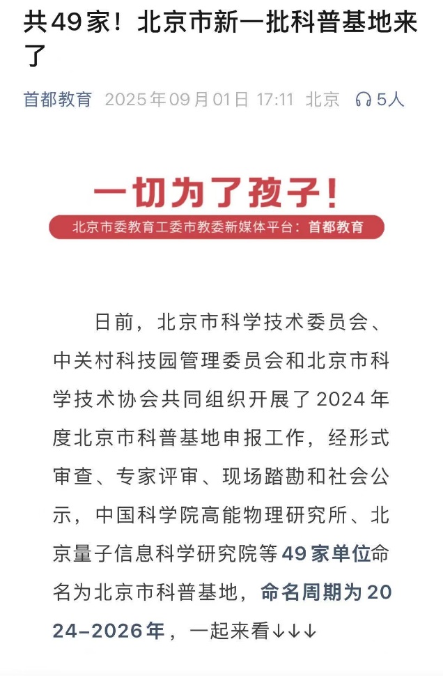 近日,北京市科学技术委员会等单位共同公布了北京市科普基地评审结果,pg游戏电子官网科学传播基地成功获评2024“北京市科普基地”称号。