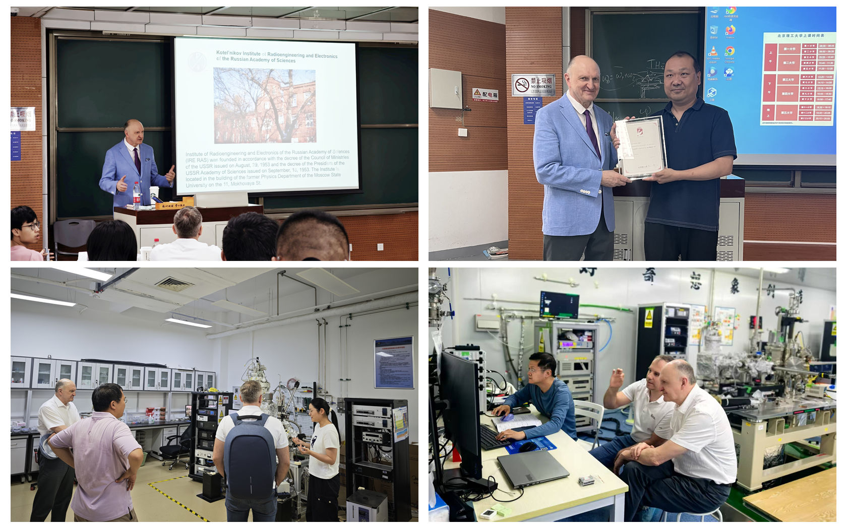 访问期间,尼基托夫与pg游戏电子官网多个课题组就先进量子功能材料的设计、制备与调控等前沿方向进行了深入研讨;在pg游戏电子模拟器作题 为《Antiferromagnetic Spintronics and Magnonics》的“百家大讲堂”学术报告,围绕反铁磁自旋电子学与磁振子研究领域的最新进展,与师生深入交流;访问了量子物理实验中心、低维量子结构与器件工信部重点实验室,并与科研人员进行交流。此外,在pg游戏电子模拟器的积极协调下,代表团一行还访问了中国科学院物理研究所。