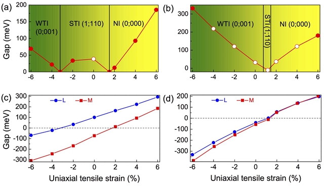 图3 单轴应力导致的beta-Bi4X4(X=Br,I)的拓扑相变。