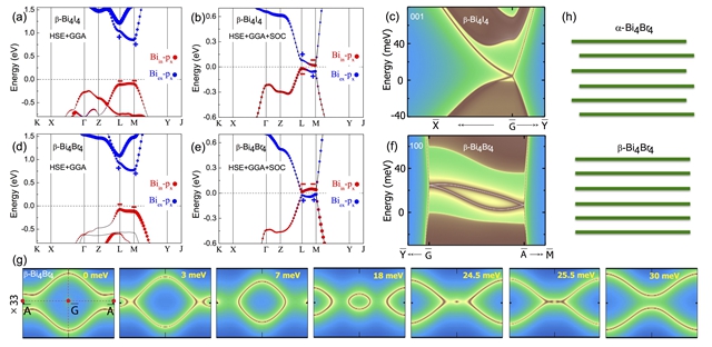图2 电子结构。(a) (b) beta-Bi4I4有/无自旋轨道耦合的能带结构。(c) beta-Bi4I4的(001)表面态。(d)(e) beta-Bi4Br4有/无自旋轨道耦合的能带结构。(f) beta-Bi4Br4的(100)表面态。(g) beta-Bi4Br4的(001)表面态的Lifshitz转变。(h) alpha/beta-Bi4Br4的堆垛示意图。