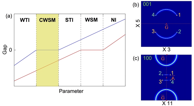 图4 (a) 相图。强弱拓扑绝缘体相变时可出现我们提出的复合Weyl 半金属。而强拓扑绝缘体和能带绝缘体的拓扑相变时可出现通常的Weyl 半金属。(b) 复合Weyl 半金属在(001)解理面的Fermi arc。(c) 复合Weyl 半金属在(100)解理面共存的Fermi arc以及Fermi circle。
